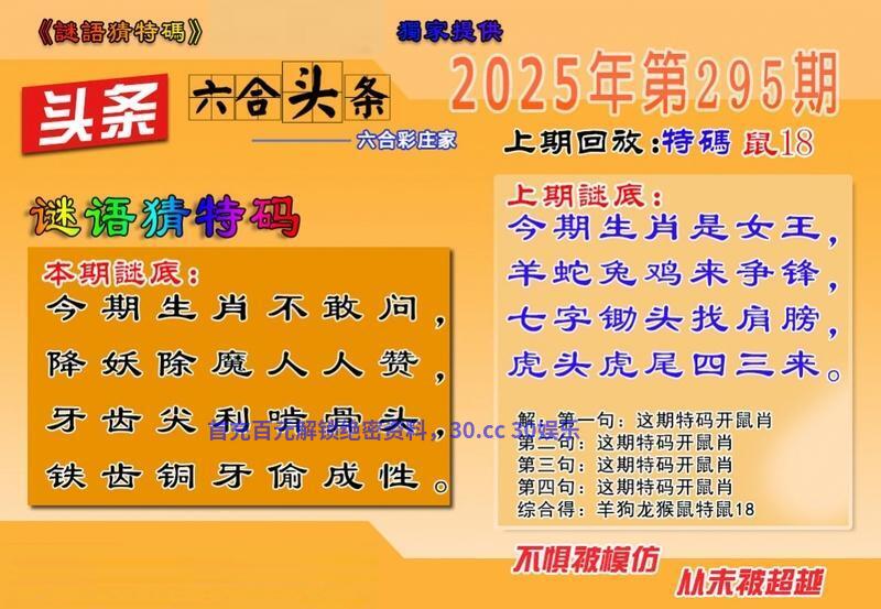 295期 今期生肖不敢问 降妖除魔人人赞 牙齿尖利啃骨头 铁齿铜牙偷成性 解译:降妖除魔人人赞指龙猴猪,铁齿铜牙偷成性指鼠马鸡 九肖:龙猴猪鼠马鸡牛兔羊 |